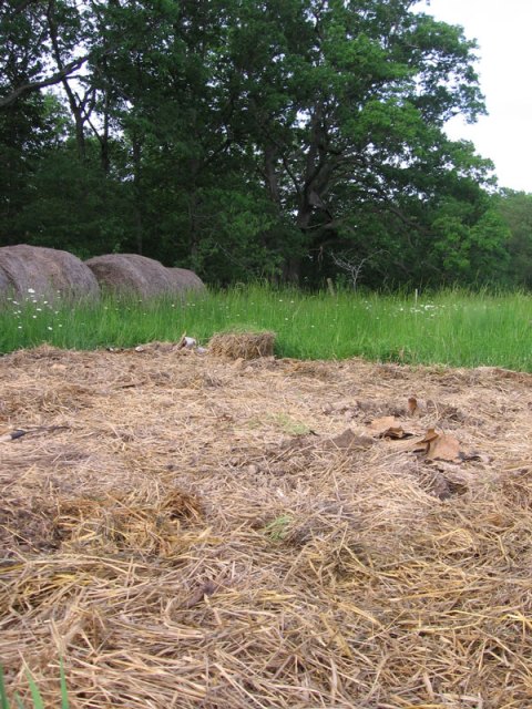 Here is the finished patch. Lots of hills or bumps in the straw. It looks like a mess of straw and cardboard here, but all I can see is a huge bright pumpkin patch! Super exciting.