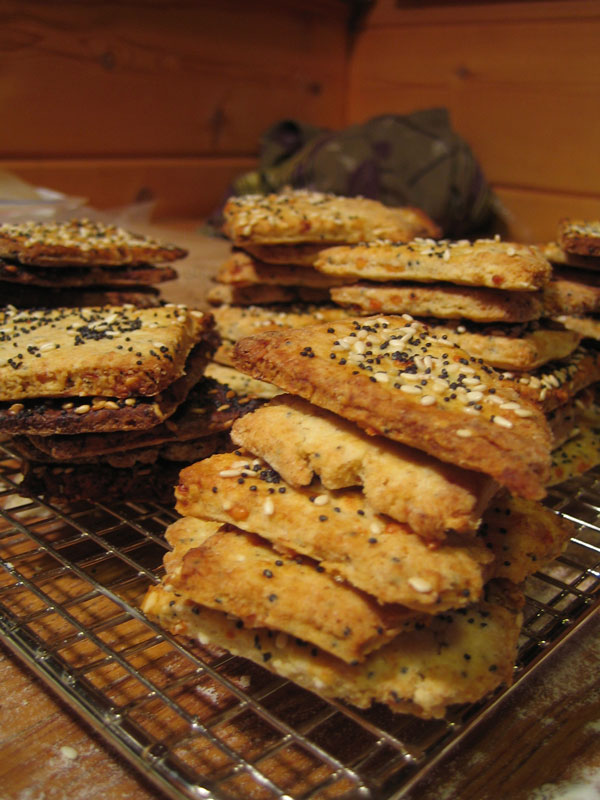 The crackers are rolled out (one time only for truly flakey crumb), cut into rustic pieces, and brushed with milk and topped with sea salt and extra sesame and poppy seeds.