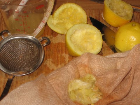 The petals re-added to the syrup, and simmered until the jam thickened. The lemon pips and pith help with thickening, and are contained in cheesecloth.