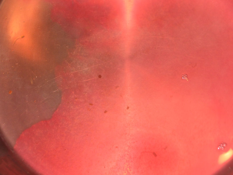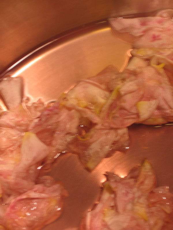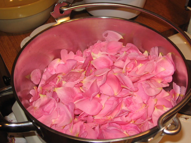 Rose petals in the cauldron. They cooked over low heat for 30 minutes. The result was a mauve rose essence, and a clump of petals.
