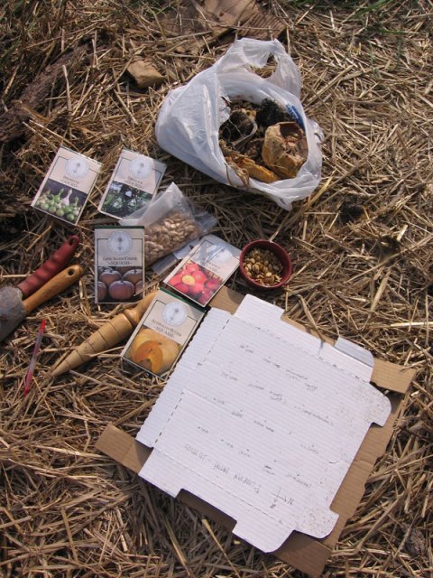 We collected seeds from pumpkins last fall, and bought a few as well. Jay had jack-o-lantern seeds, and I had some squash seeds leftover. We planted long island cheese, austrian butter, and a few other types of pumpkins as well as two gourds, birdhouse and dinosaur (from Seed Savers). The patch map is on the back of a pizza carton, and shows where we have put everything. We still have openings in a few hills, and are planning on planting some of the giant, state fair-prize-winning pumpkin types…
