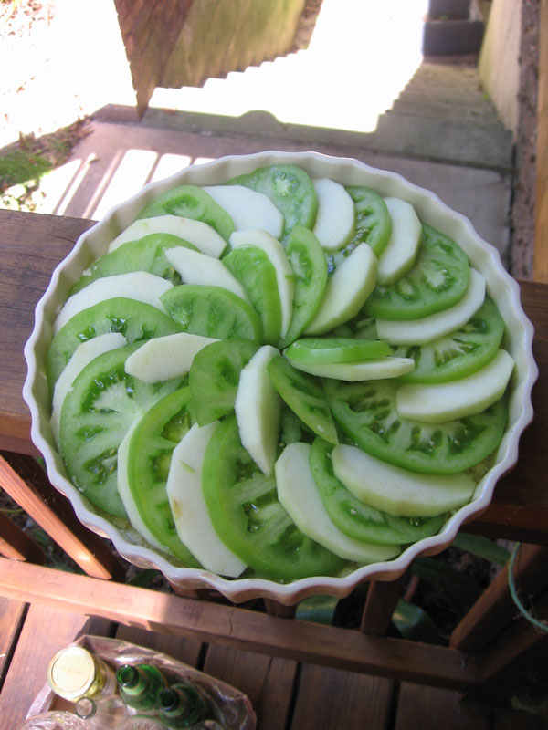 Then I arranged apple and green tomato slices around, covered with lemon juice and dusted with a sugar and flour mixture. (You are supposed to use corn starch, but I didn’t have any.)