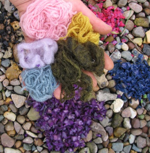 We took the finished wools out to the driveway to dump the dyestuffs, and rinse. They looked beautiful all laid out amongst the rocks. The final wools kept different amounts of the original dyes. Some faded more than others…so exciting!!
