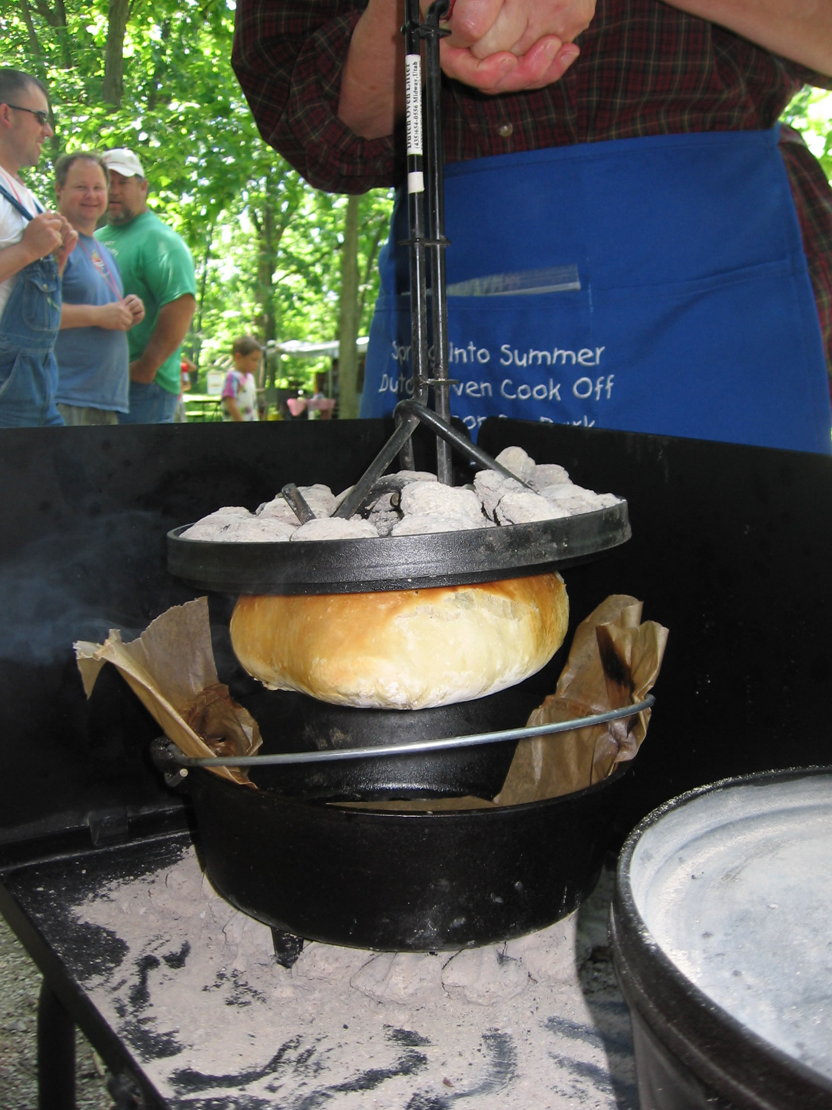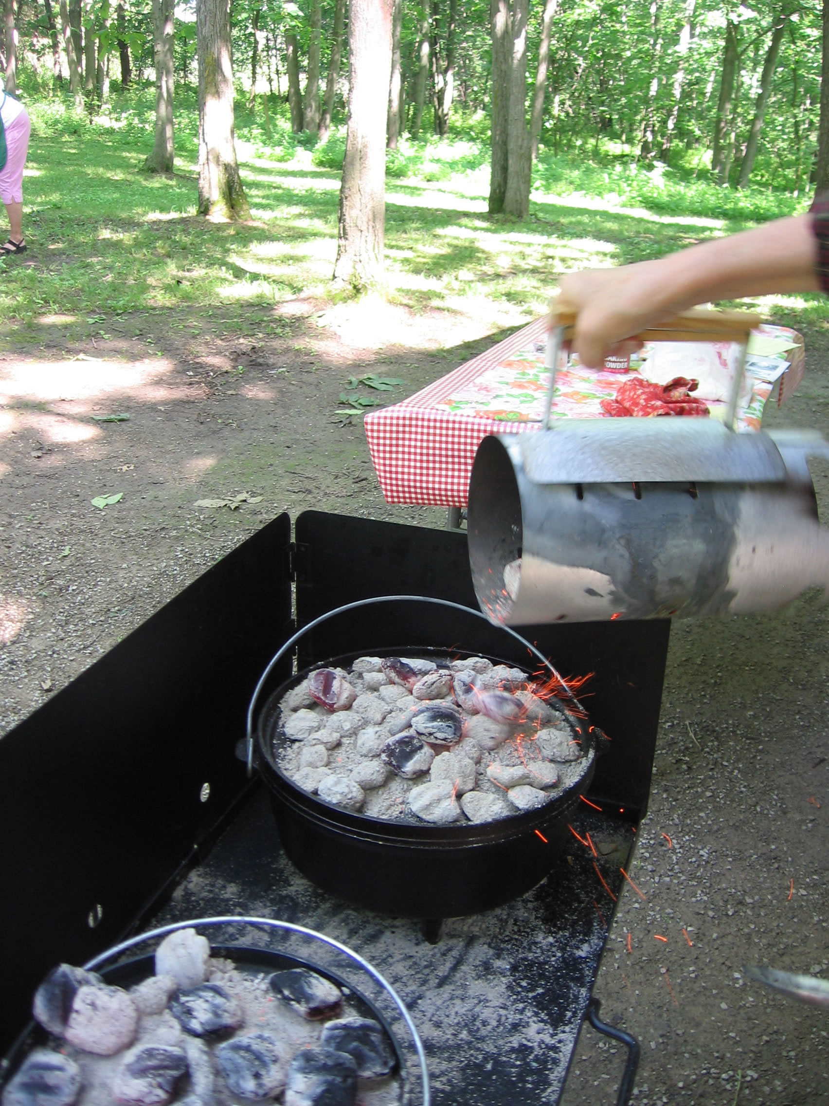 Coals on top, coals on bottom. There is a specific number that you are supposed to put on for the different sizes of dutch ovens, and for different baking temperatures.