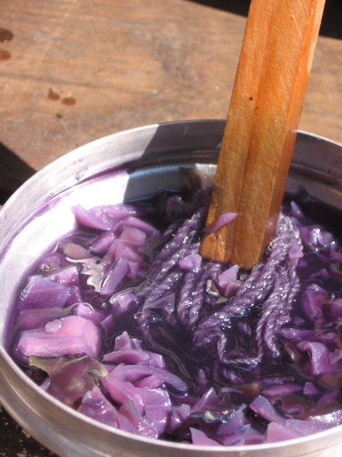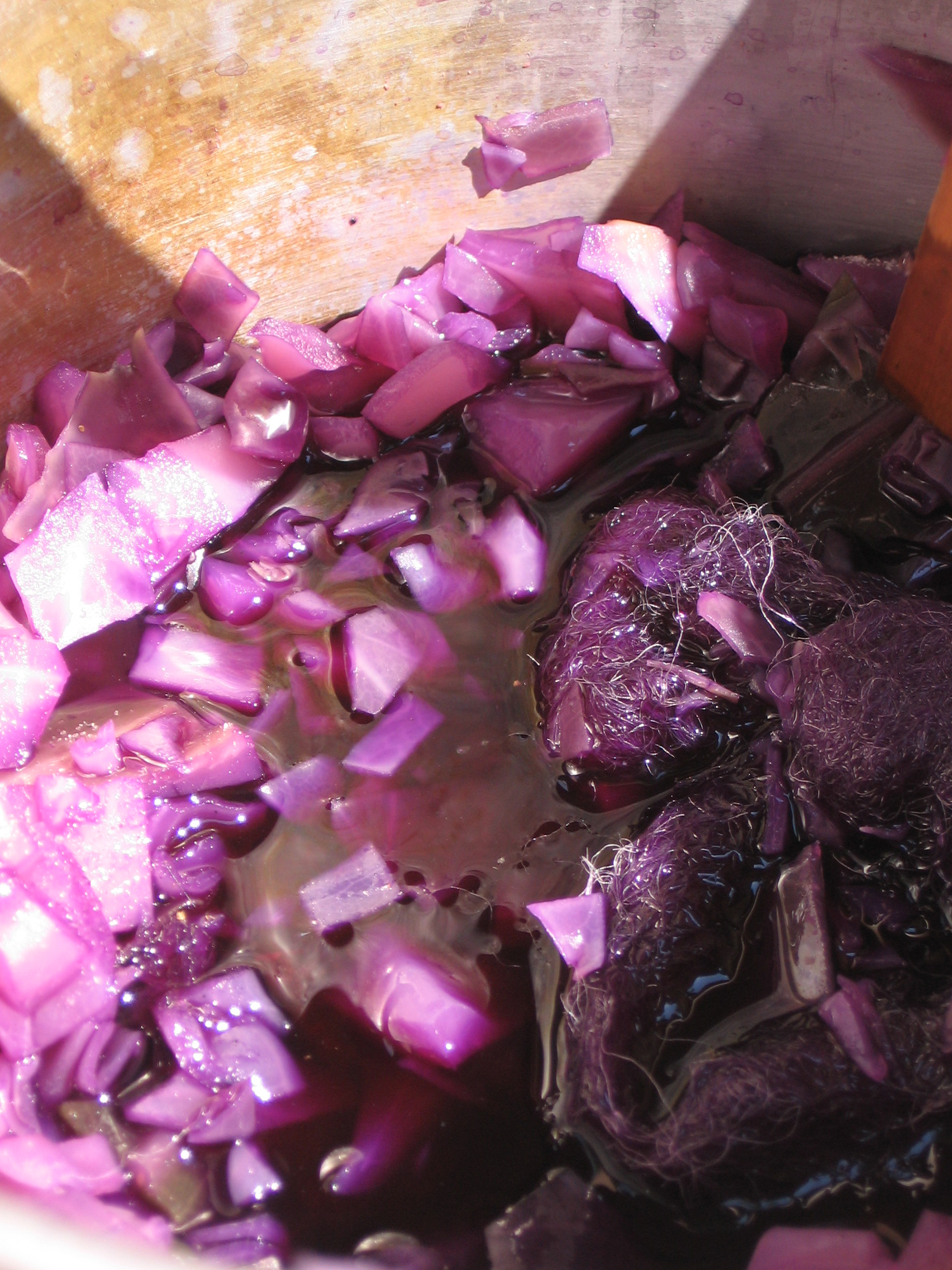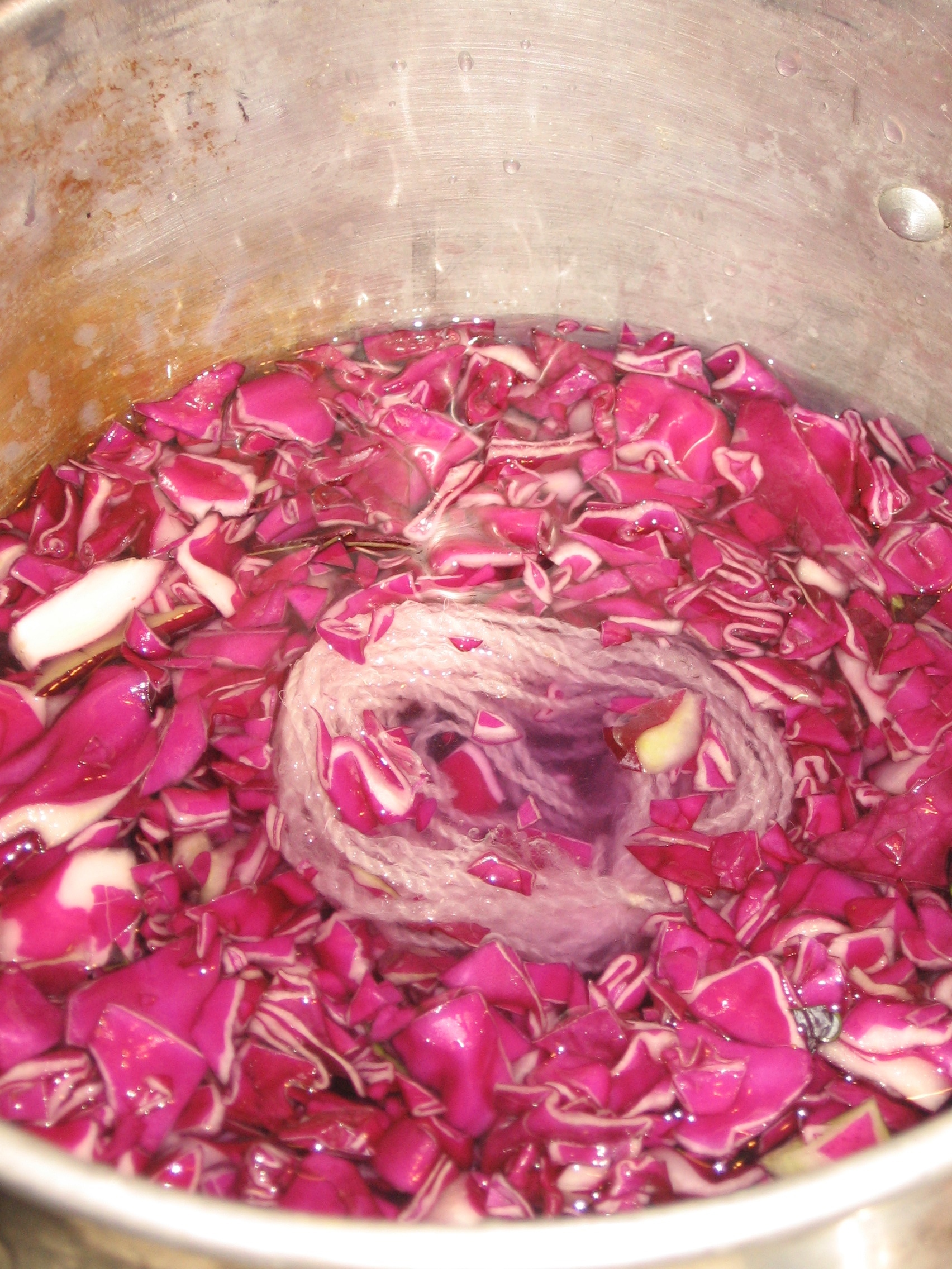 Meanwhile, the cabbage was very gently simmering on the stove. We used three separate batches of yarn (two yarn, one roving) to test the different mordants.