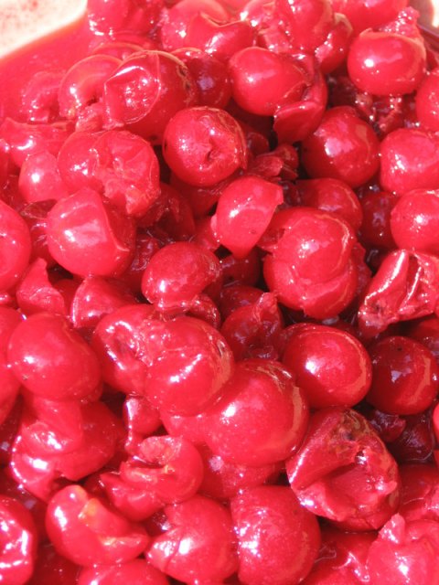 Cherries. My first attempt ended up with 8 jars of what my sister calls “Early Bird” cherry preserves.