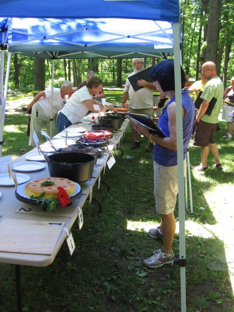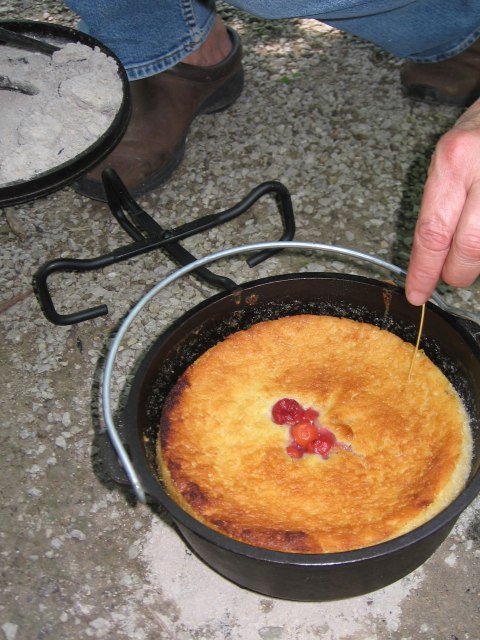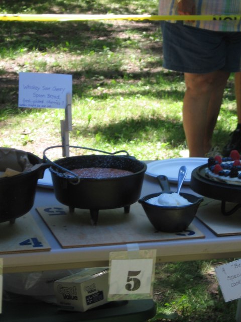 For the dutch oven cookoff we made a whiskey sour cherry spoon bread. A not too sweet cake, rich with butter, and filled with fruit. Cherries soaked for a few days in whiskey and sugar.