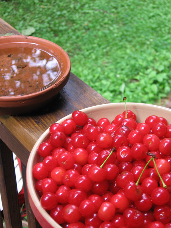 I have a jar of cherries on my porch. They are solar cooking in a broth of sugar and whiskey. I got sick of pitting all the cherries, and this recipe called for unpitted (and unwashed) cherries, whiskey, and sugar. I had all the ingredients, as well as a quart jar, so I made use of them.