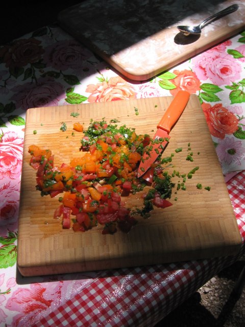 And the result was delicious. Hot and bubbly. To top off the dish she made a fresh salsa of tomatoes, jalapenos, cilantro from the garden, and a touch of green onion.