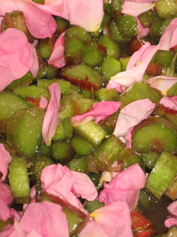 The rhubarb and sugar were mixed first, and left to sit. When the sugar had mostly dissolved, we added lemon juice and rose petals.