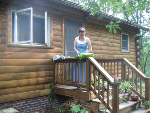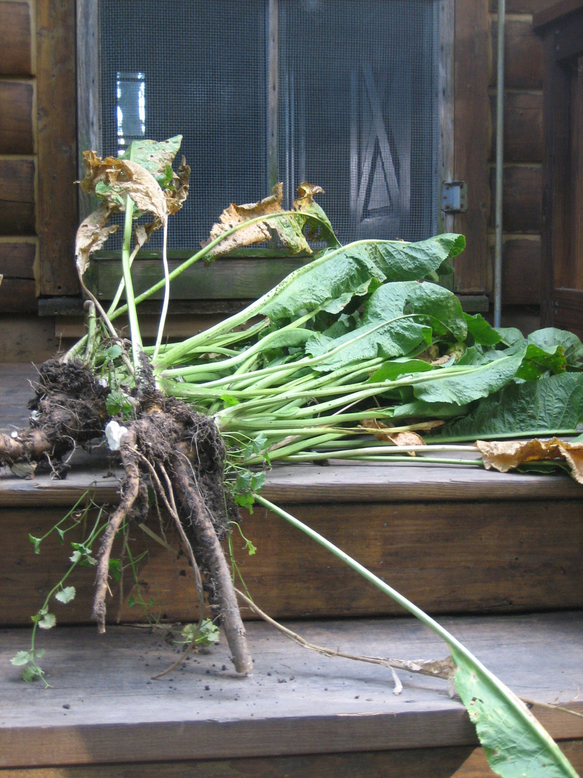 I found a recipe in my pickling cookbook (The Joy of Pickling) for a brined dill pickle using horseradish and mustard seeds. I love horseradish, and tried to find some fresh in town. I had no luck, and then called my friend Bob in East Pleasant Plain and he pulled up several plants for me. I have way more than I needed for the recipe, so I am going to preserve the rest in sugar and vinegar, and then plant the tops of the roots so that I can start a patch of my own!