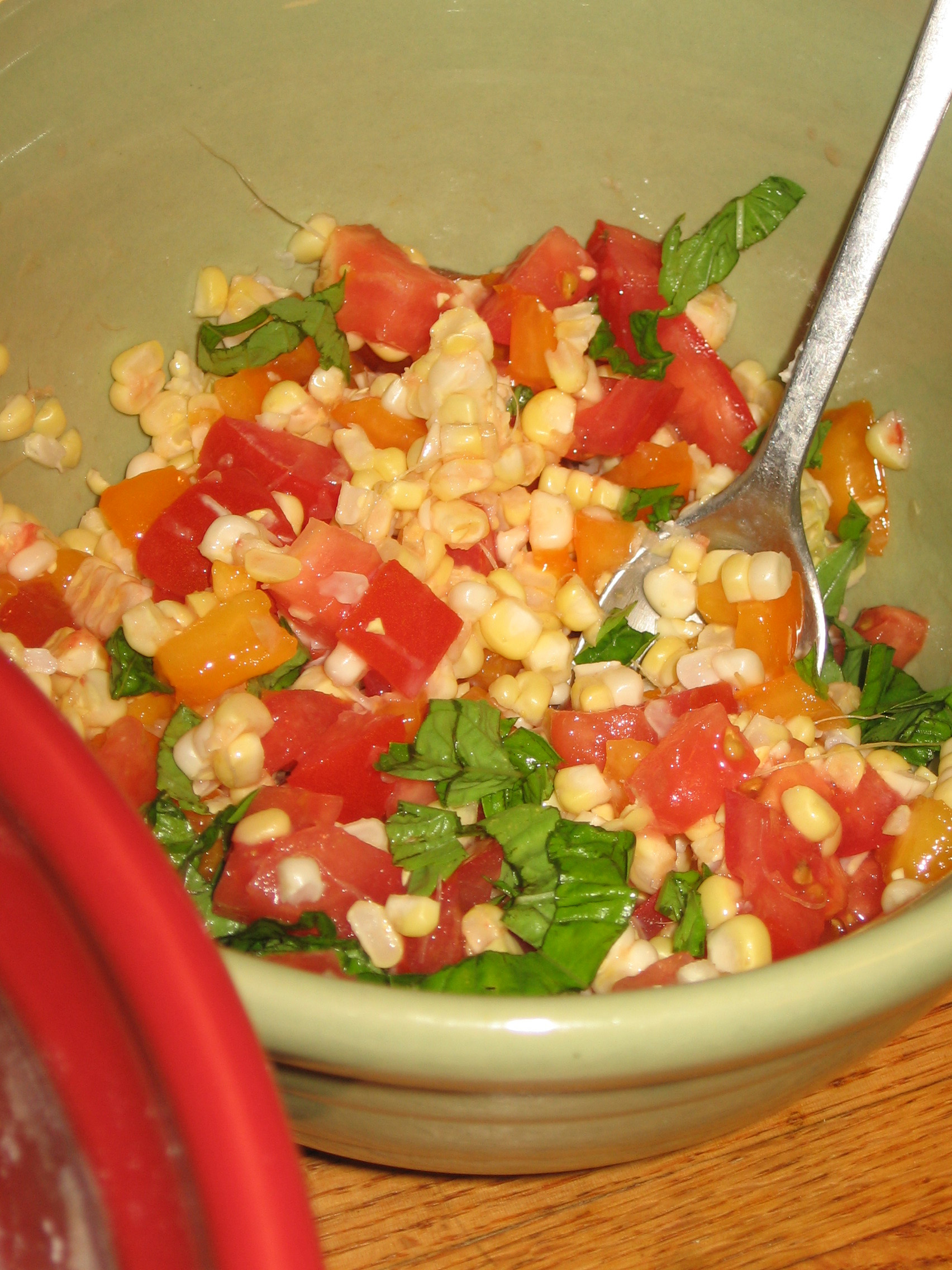 I made two crusts, and put them in the oven for a little while first to bake so that they were nice and crispy when I was finished. While they were baking, I chopped some tomatoes, and cut the kernels off of a few ears of corn. I sauteed this in butter, with fresh basil and salt.