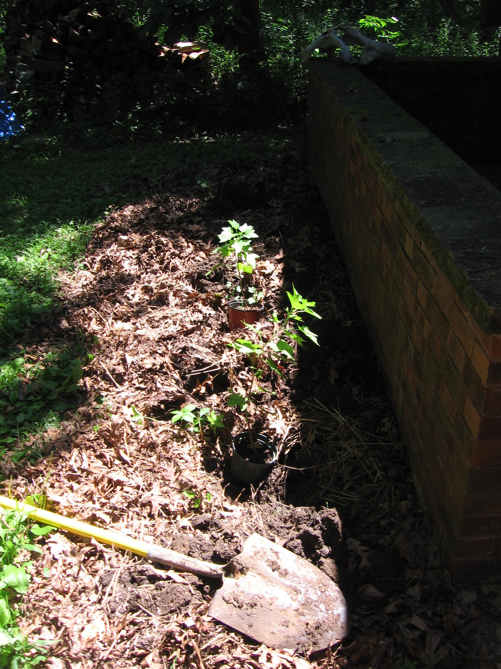 There is a beautiful brick wall that my grampa built around the stairs to the basement. My front yard is north facing, tree filled, and pretty shady (although sunny right now in the middle of the day in the summer..). The space in front of the brick wall has been a convenient resting place for dead leaves, twigs, and spiders. A friend of mine gave me a bunch of black currant plants from the bushes in her yard, and I decided to try to create a currant hedge. I love currants! I can still remember the first time I had a big wooden basket of them, in the train station in Switzerland, with my best friend. They are a joy to eat, and the idea of walking out my kitchen door to a patch of currants is lovely!