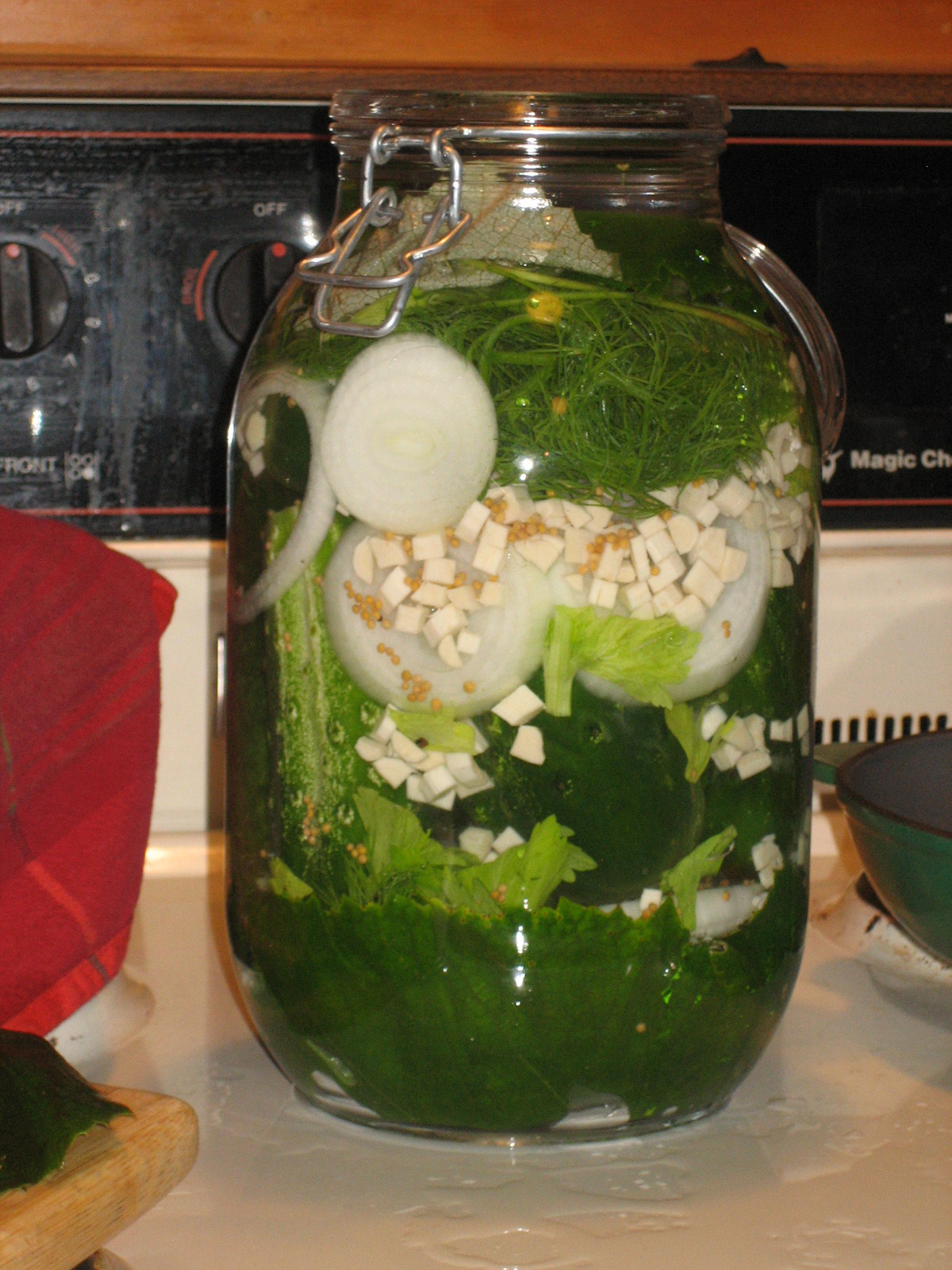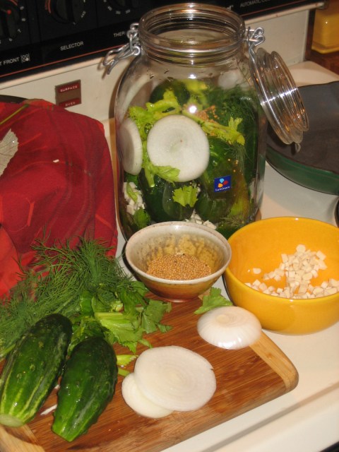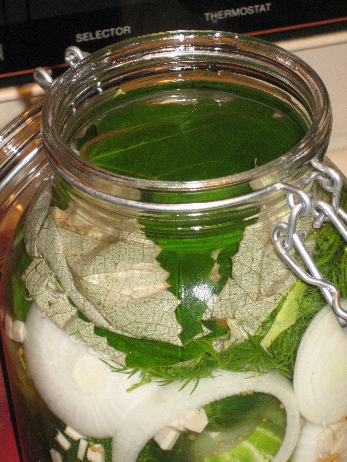 The recipe also called for a handful of grape leaves. I picked some from my dad’s vine, and laid them in the bottom of the jar. I then layered the cucumbers, dill sprigs, chopped horseradish, onion slices, mustard seeds, and celery leaves in a 3 liter glass jar.