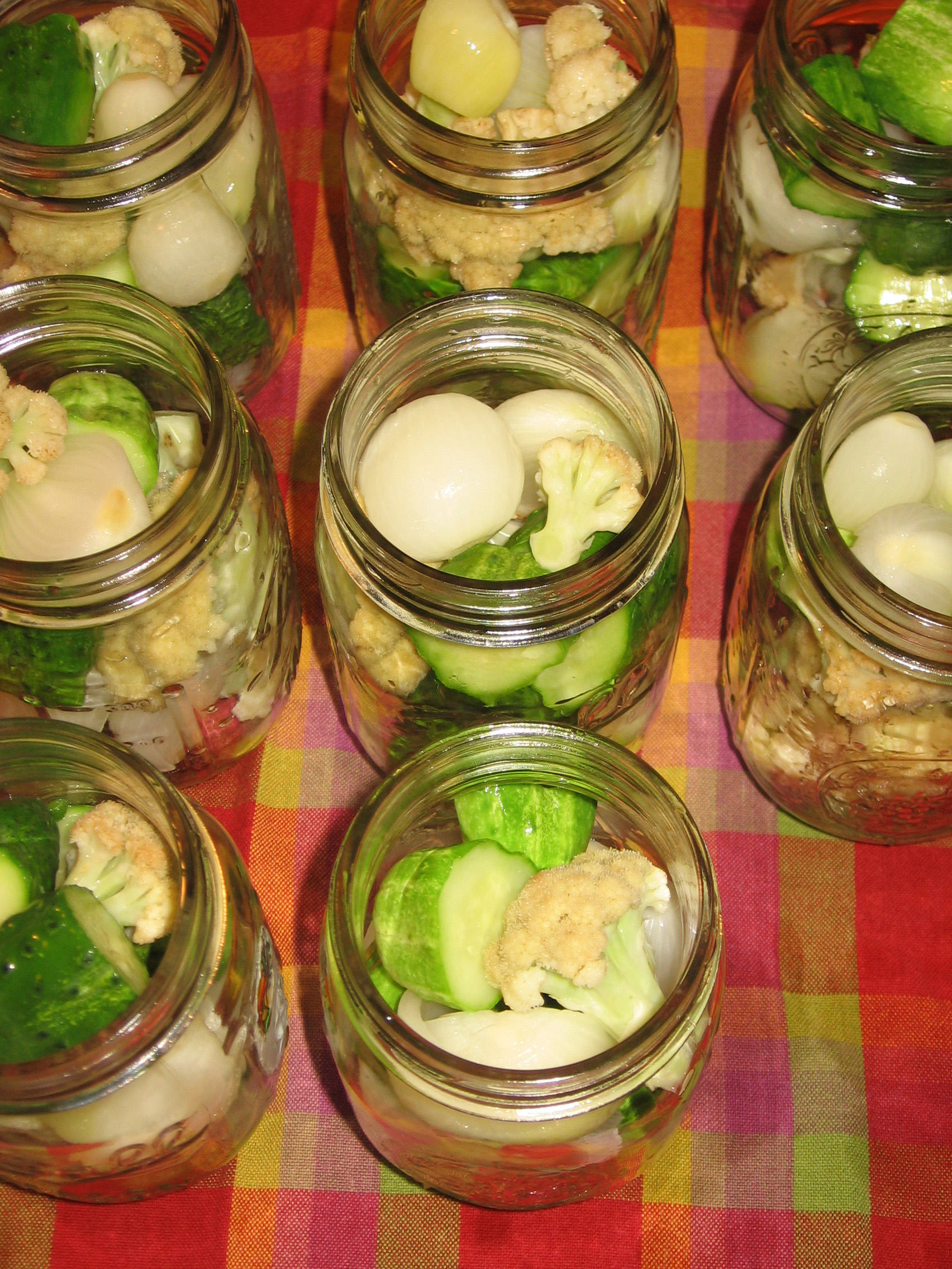 Meanwhile, I took the drained vegetables out of the fridge and divided them between 8 pint jars. When the vinegar mixture was just to boiling, I poured it over the vegetables, sealed the jars and processed them as usual.