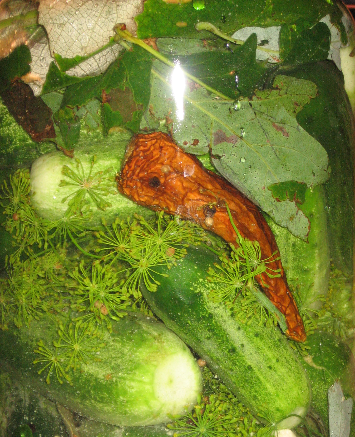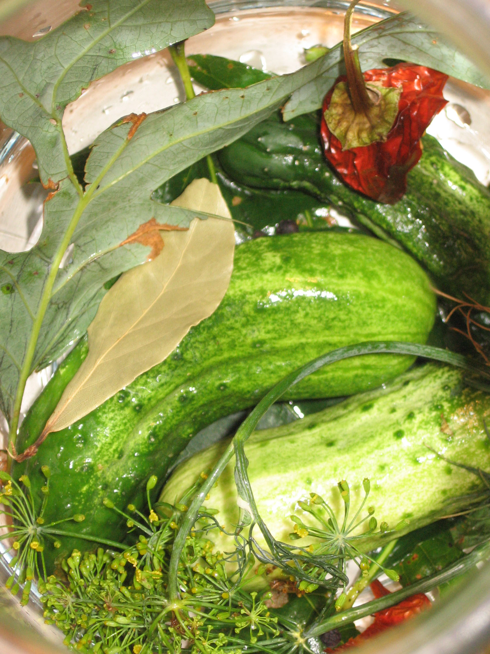 This recipe included hot peppers, garlic, mustard and coriander seeds, peppercorns, and bay leaves. The pickles are covered with a layer of oak leaves, and then some grape leaves, and then pressed down with a glass disk to keep everything submerged in the brine.