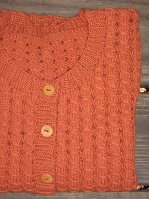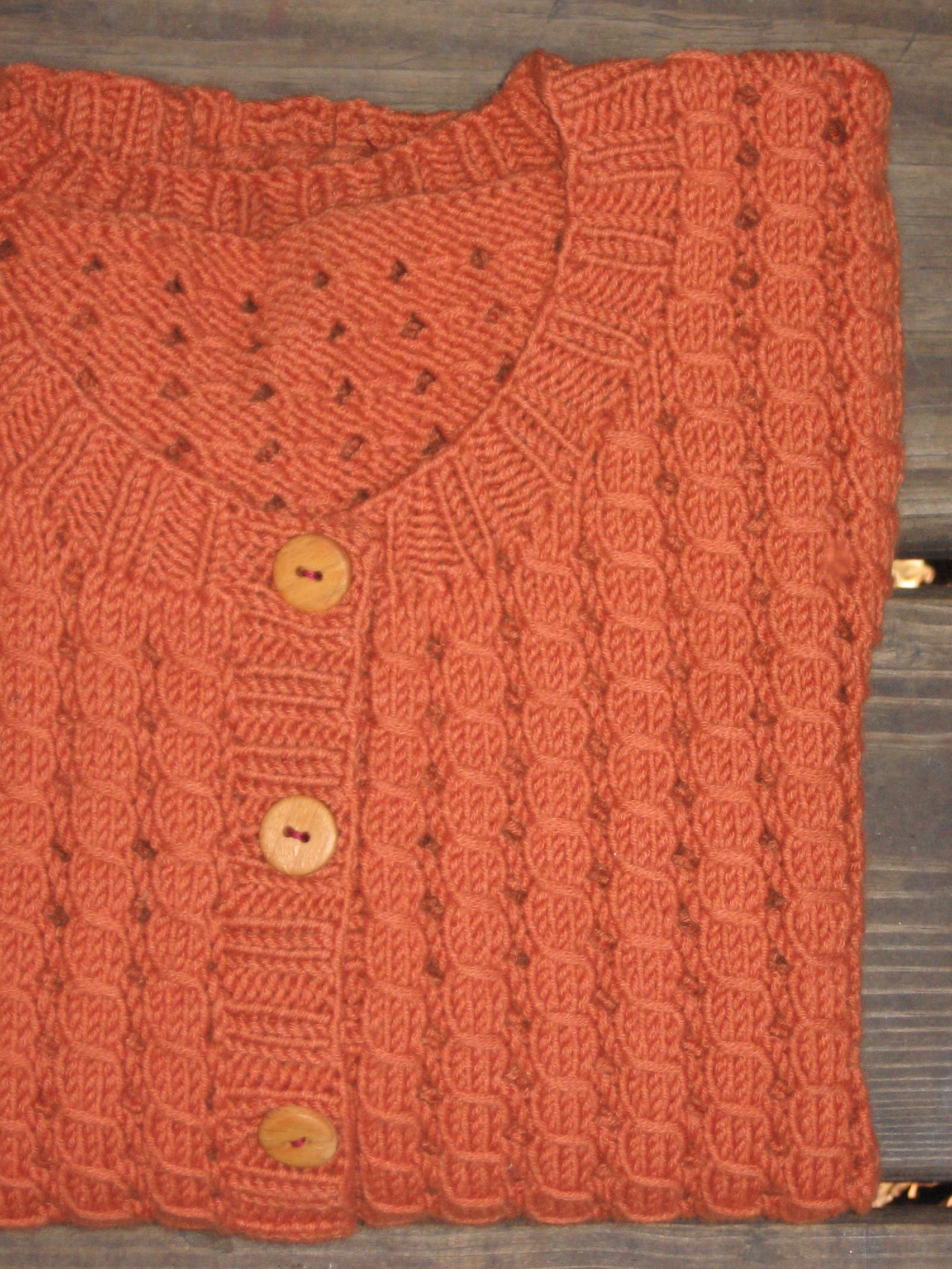The pattern is a four stitch, four row repeat. It was simple, but engaging, and kept the knitting a little bit interesting. There is six inches of ribbing at the bottom of the sweater, and no side shaping. I was a little worried that it wouldn’t fit well, but the ribbing seems to do the trick.