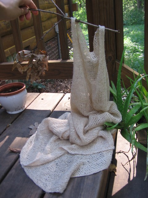 I used three very fine strands of fiber stranded together throughout. The gauge was about the same as for the linen tunic, but the weight was much much lighter!