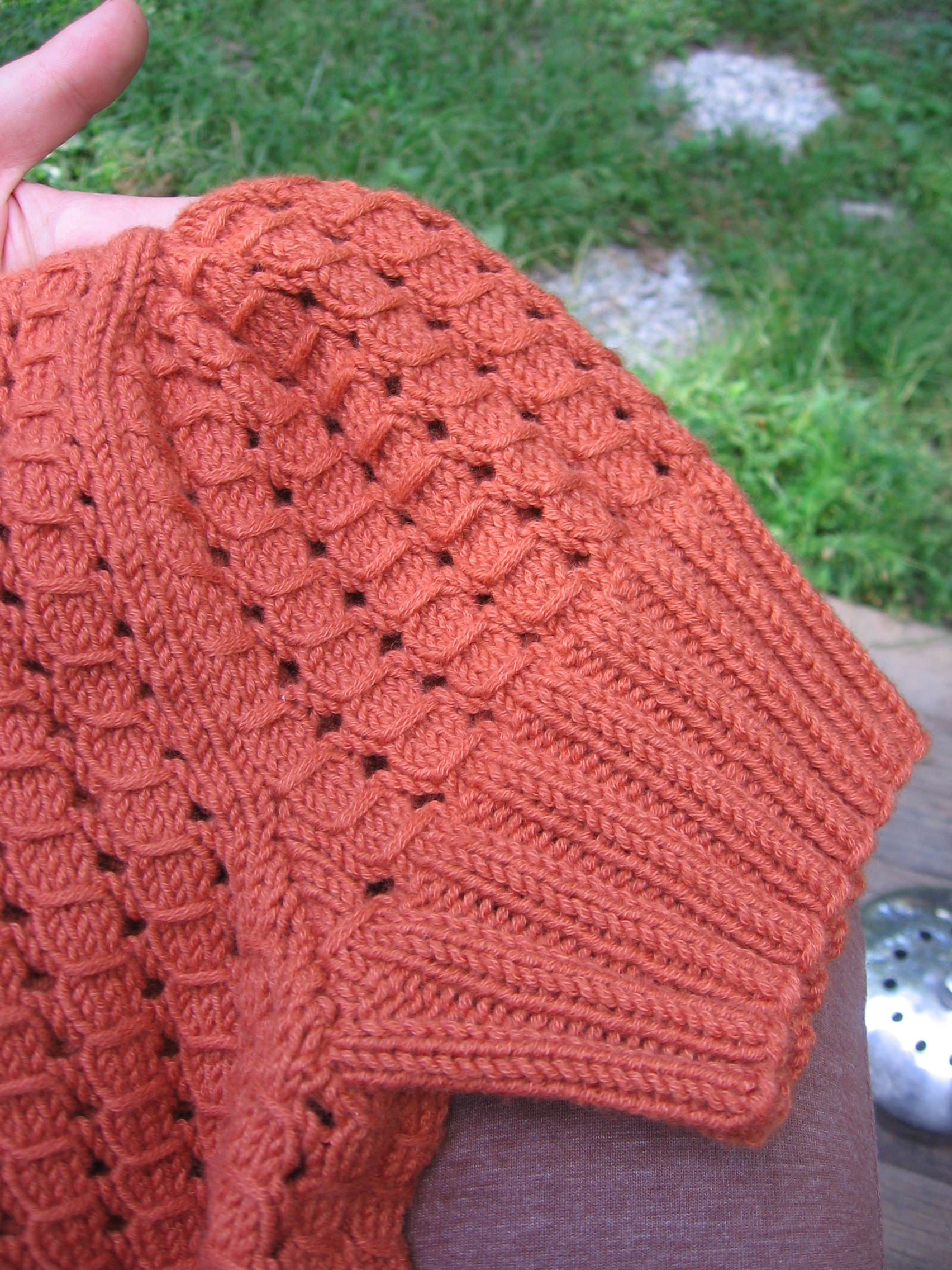 I have been on a sweater knitting kick this summer. We just got a new batch of beautiful yarn into the store. It is a Rowan wool and cotton blend, and organic! Very soft, and just a little bit shiny. I had been eying the pattern for this sweater for a while, and when we got the yarn, I decided to use it.