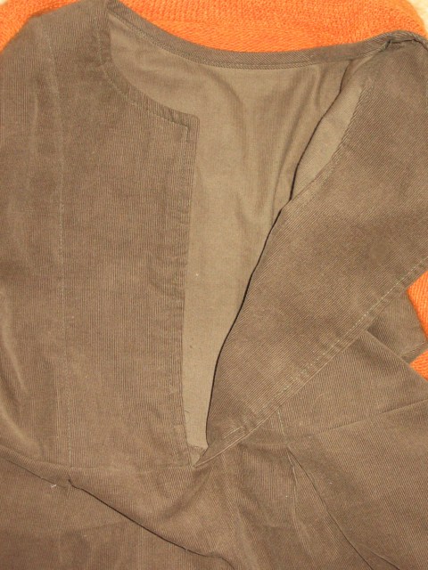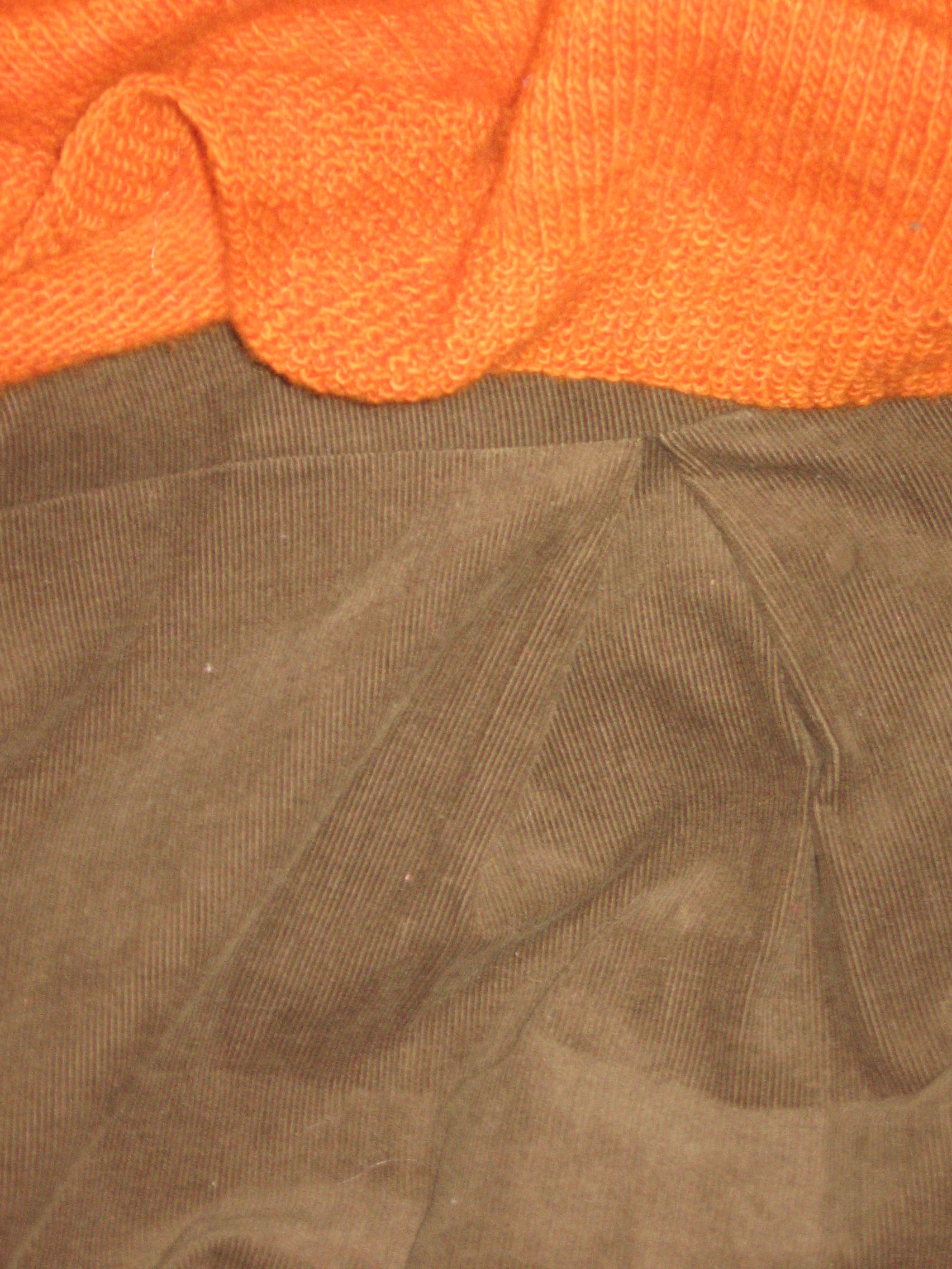 I have recently gotten back into sewing, and found a pattern for and made a little green dress. The bodice (I think that’s what it is called) is short, and when I tried a normal length sweater over it, the skirt rumpled up kind of funny. I dug into the knitting pile in my spare room this morning, found the unfinished orange sweater, tried it on, and it worked just about perfectly! The sweater sleeves are a little bit tight over my arms and the corduroy sleeves, but I think that I can manage, and maybe the wool will stretch a little.