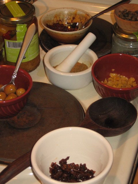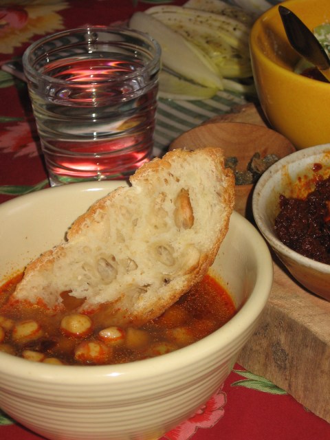 The fun of this stew is in the condiments. Basic chickpeas, and then little dishes of toppings.