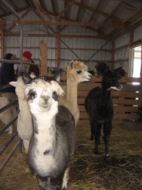 Here is my dad with Star Gazer and her baby, Morning Light. Maybe they detect a bit of alpaca. They definitely were sniffing the vest, although they might have been looking for food, as we were feeding them..