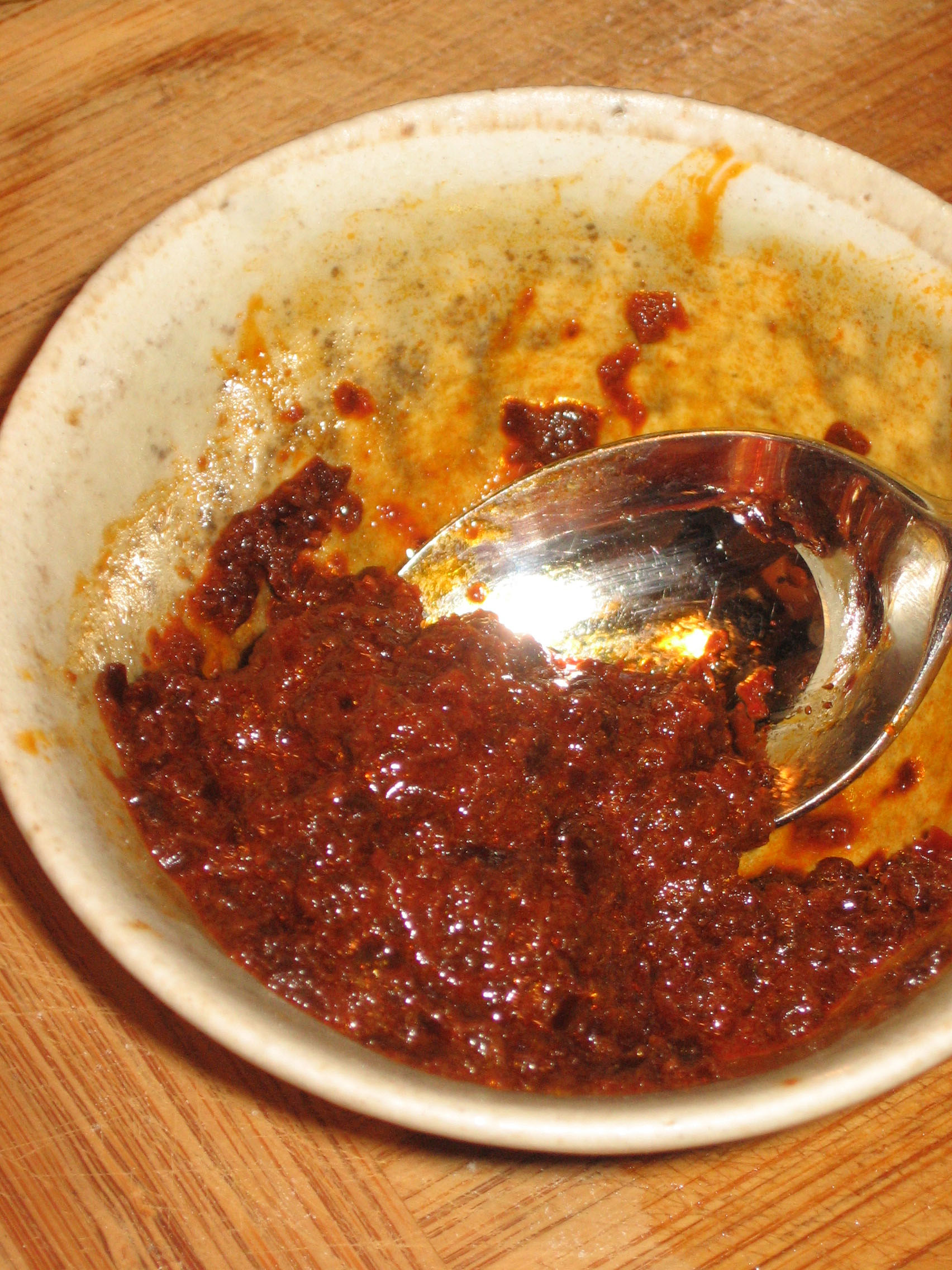 Harissa is a paste made from sun dried peppers and tomatoes, mixed with garlic, cumin and olive oil. It is my favorite condiment, delicious with so many things. Its spicy-ness adds flavor and depth! Heli taught me to mix the harissa with water and olive oil, “to open up the smoky flavors,” and to ensure that it mixes into the soup thoroughly.