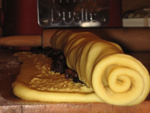 I made up the dough and filling, went out for a bit, and returned to a balloon of dough in my red bowl. It punched down nicely, and I shaped it into a large rectangle.