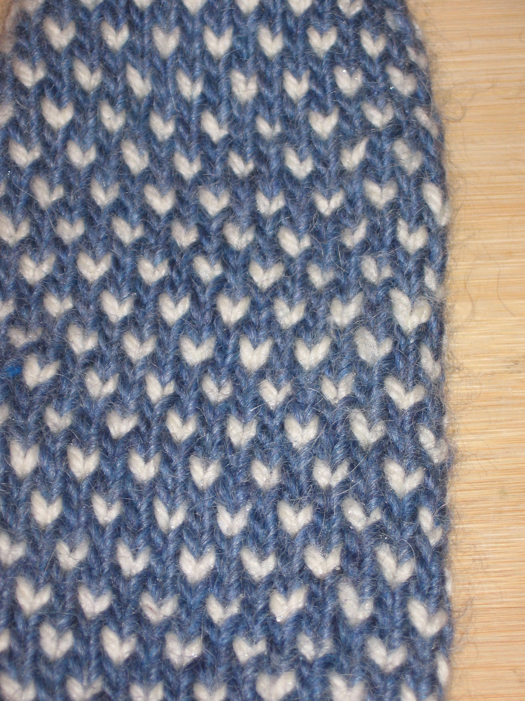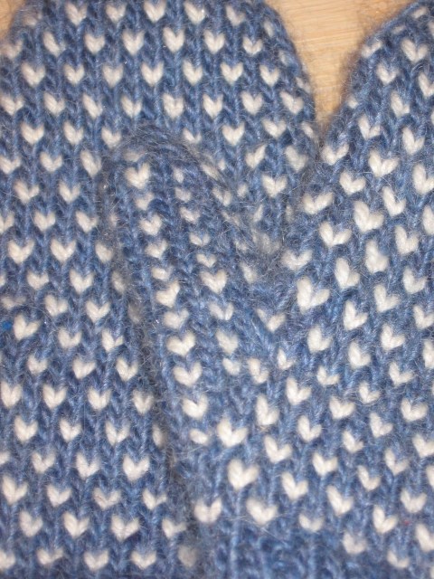 The overall stitch pattern of the mitten is offset, alternating blue rows and blue and white rows. On the thumb there is a subtle difference, and the white dots line up, creating vertical as well as horizontal blue stripes. It worked out better this way with the thumb gusset increases.