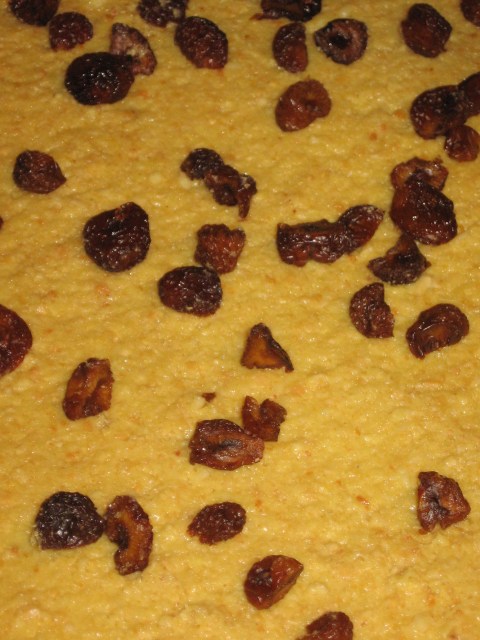 I feel like this should be my grandmother’s recipe. But it isn’t. I found it in Vegetarian Cooking for Everyone, by Deborah Madison. A babka, from my understanding, is a cake made with a rich yeast dough, and filled with various things. In this case, almonds, cherries, etc.