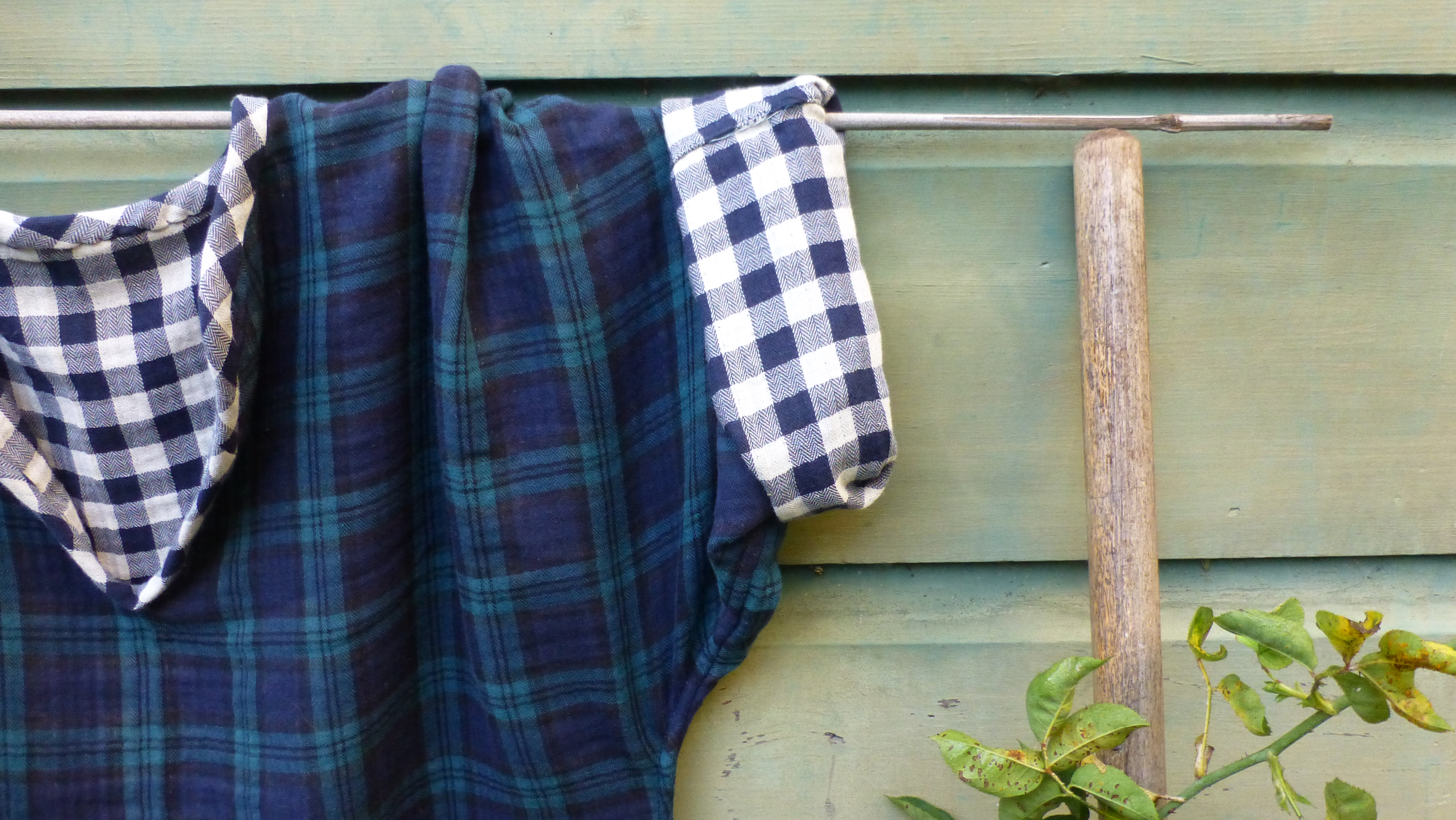 The above two are opposites. The fabric is the same, reversible double layer cotton, but the tunics were made with different right sides. On the left, with the checks as the right side, and on the right with the plaid. It was fun for me to see how the different materials looked, fit, and felt. Some people look better in small prints, and some better in large prints. It is interesting to see the same shape, with different prints, colors, etc, tried on different people. They are both mostly reversible, although the inside seams aren’t quite as nice as the outside ones.