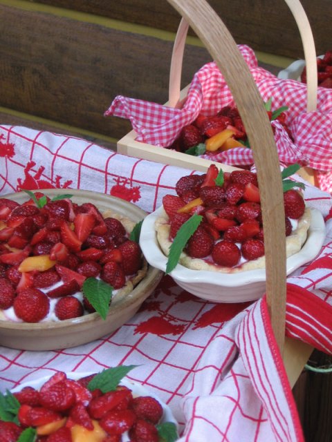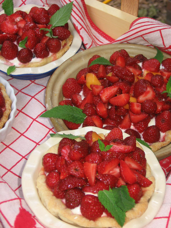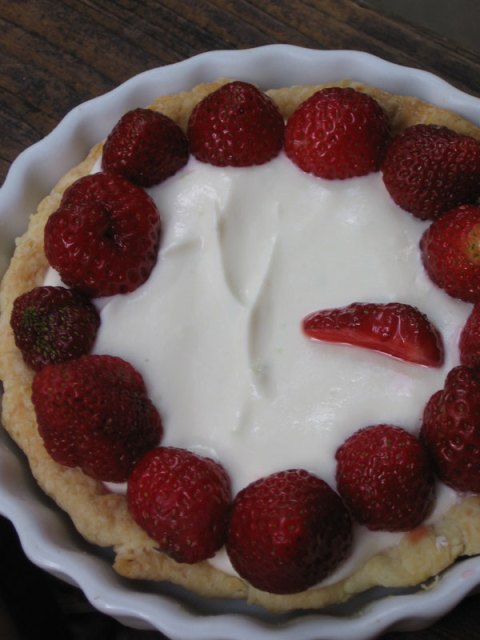 I love the idea of strawberry pie. Fresh fruit, cream, and a buttery crust are all I need to be happy (for a few moments anyways). Oh, and maybe a sprig or two of mint, too.