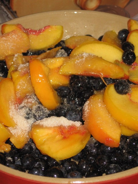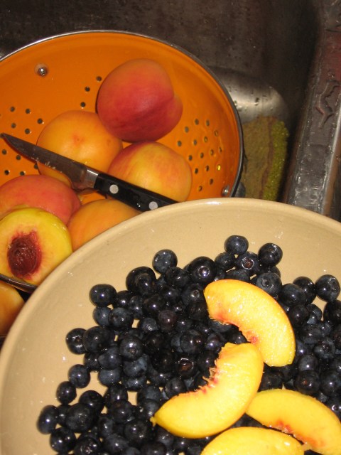 I ran home this afternoon with a brown paper bag filled with peaches to a fridge filled with blueberries (okay, not filled but containing blueberries). I had a few minutes, and wanted to put the fruits together into a baked something. It is too hot right now for me to bake a pie (my kitchen isn’t air-conditioned, and that makes for a wimpy crust, and lots of frustration), so I went for a cobbler.