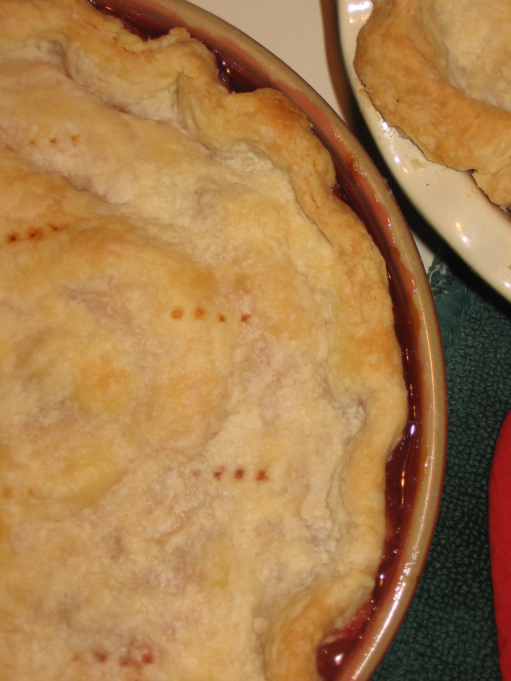 I picked up a box of butter on my way home from work, and made up a double batch of pie dough. (I like to bake my pies in twos. When you go to all the trouble to bake a pie, might as well make another one…) For the filling, I used about 8 medium-sized peaches and one bag (about 6 cups of pitted cherries). I dropped the peaches in boiling water to skin, and sliced into wedges. I added about 1 1/4 cups sugar for both pies, and a bit of flour as the cherries were very juicy. And dotted the top of the fruit with a few tablespoons of butter.