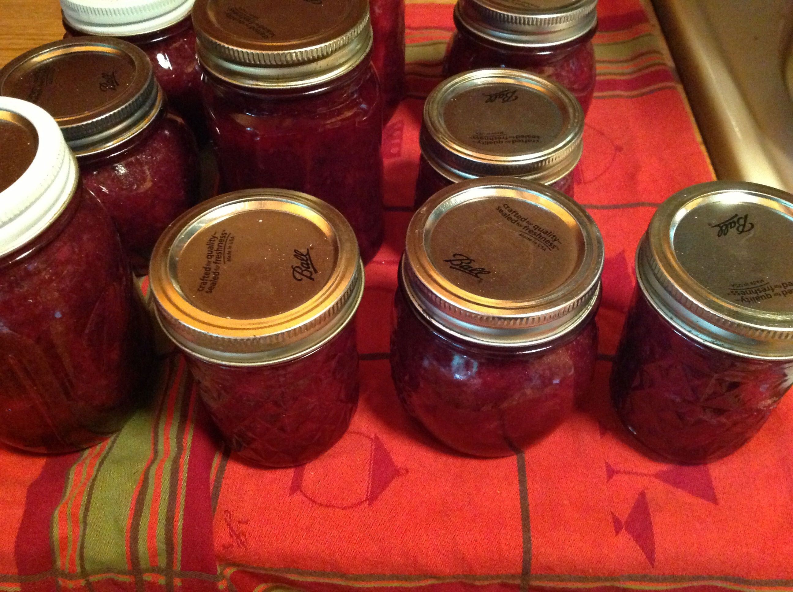 I mixed blueberries, a package of frozen dewberries, apples, and the juice and zest of two lemons. I added some sugar, but not too much. I simmered the whole thing for about 20 minutes or so, and then let it sit for a few hours. Then I reheated it, and processed the jars in a hot water bath.