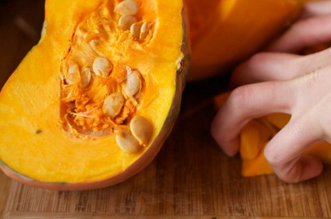 I started the soup with “winter broth” from The Greens Cookbook, by Deborah Madison. Winter broth is my absolute favorite comforting winter food. I added extra pumpkin (including seeds and peels) to the broth because it was intended for pumpkin soup. The main soup pumpkin came from the farmer’s market about 3 months ago! Talk about long-lasting. Swati rinsed the seeds and set them out to dry to save for my pumpkin patch next summer.