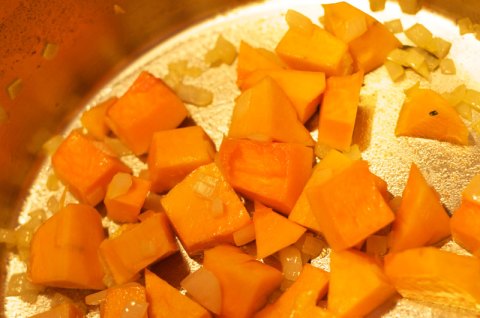 Then I sauteed a little onion in some olive oil and added cubed pumpkin, and winter broth to cover. I put the pot on the wood stove to simmer. When the pumpkin was tender, I pureed it and set it aside.