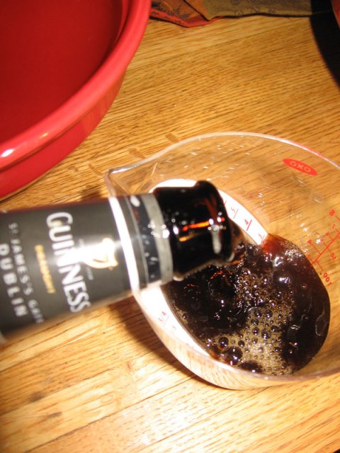 This particular recipe, by Nigella Lawson, calls for called for Guinness, and so I went to Drugtown and purchased a 6 pack (taking care to get the “real” stuff imported from Ireland), for which I only needed one cup…