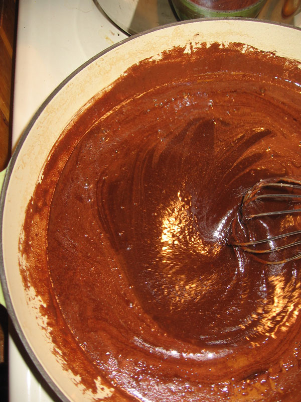 The beer is heated in a large saucepan with the butter, and it created in my kitchen a deliciously tasty aroma of beer and butter…sounds kind of gross, but it wasn’t . I have never mixed a cake in a saucepan, and was a little worried that I might cook the eggs and sour cream mix (being incorporated below). I didn’t though, and everything went smoothly, and I got the batter into the springform pan and into the oven.