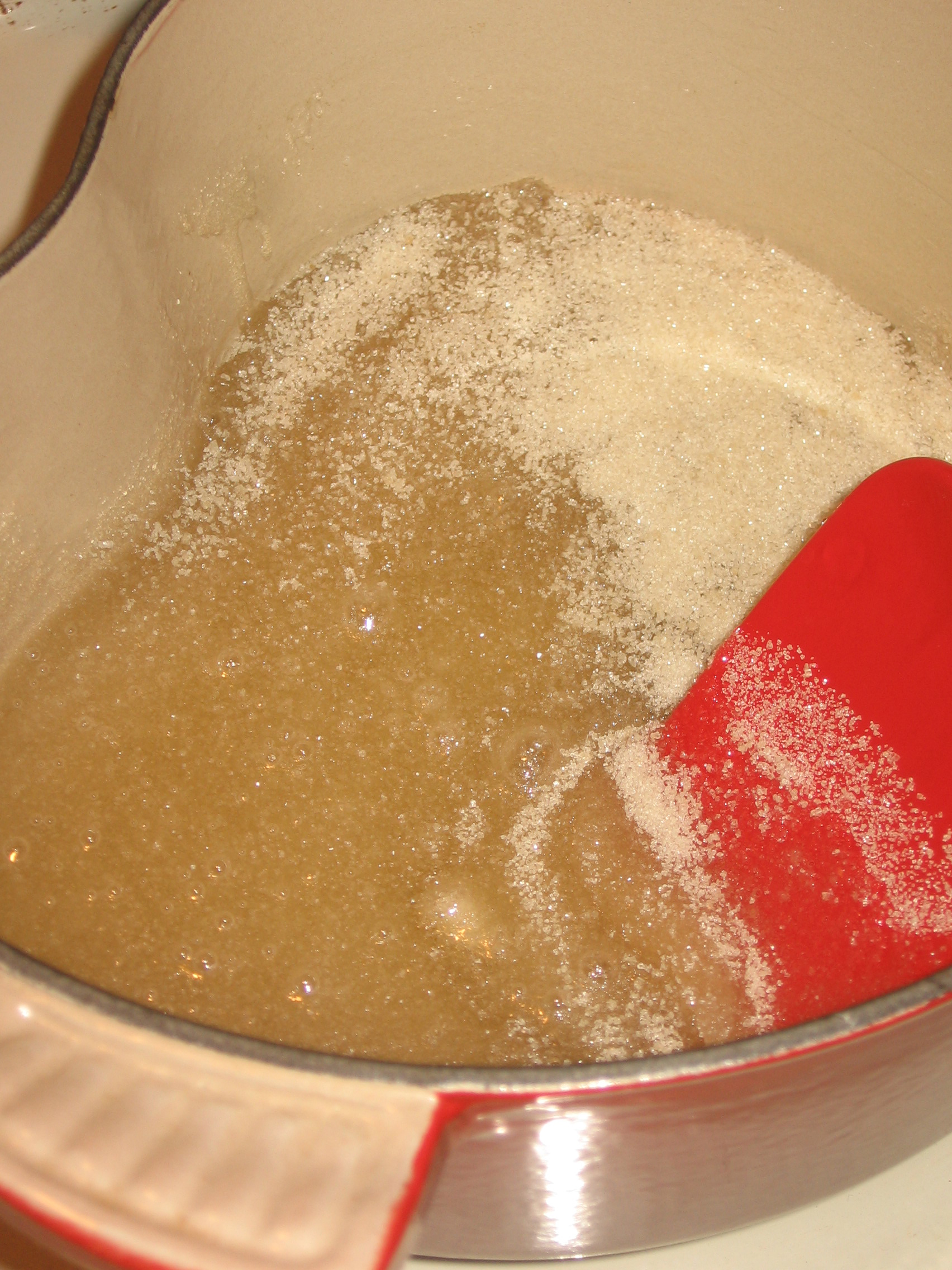It is a recipe from Saving the Season, and originates in Southern France. It is a simple recipe. Place sugar in the bottom of several very large glass jars. Layer fruit on top, pressing down a bit as you go.
