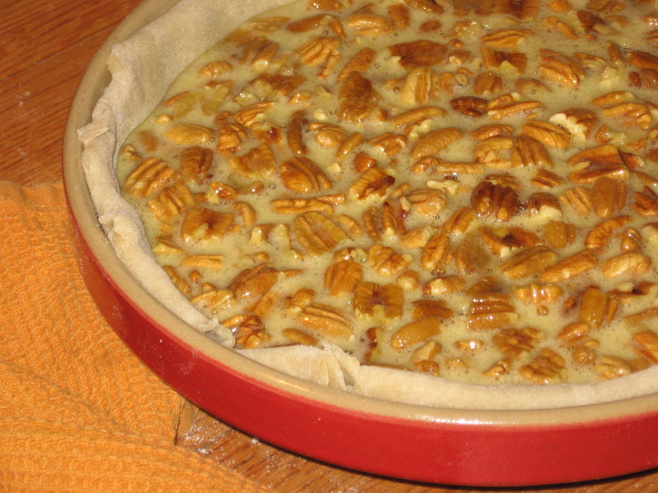 I didn’t follow the recipe exactly…which is typical. I was afraid to add the eggs right into the hot syrup, so I whisked the butter and syrup into the eggs, bit by bit. I also added an extra 1/2 cup pecans…