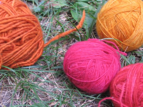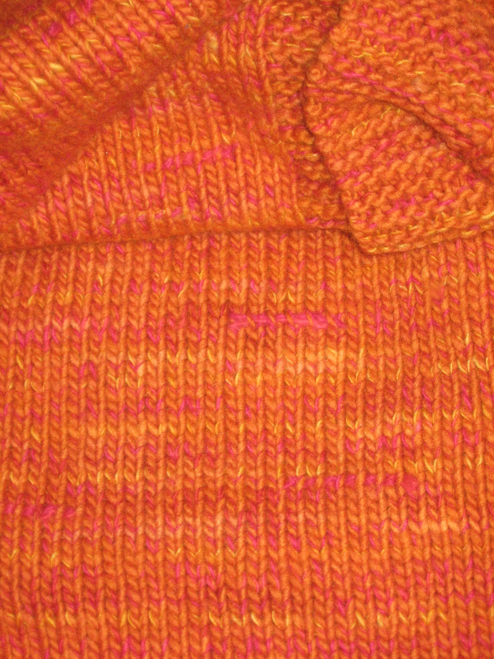 This is another orange sweater. One strand of thick yarn, and one strand of thin yarn held together throughout. The thin strand kept changing, from yellow, to pink, to red, and back and forth between. The thick strand stayed orange.