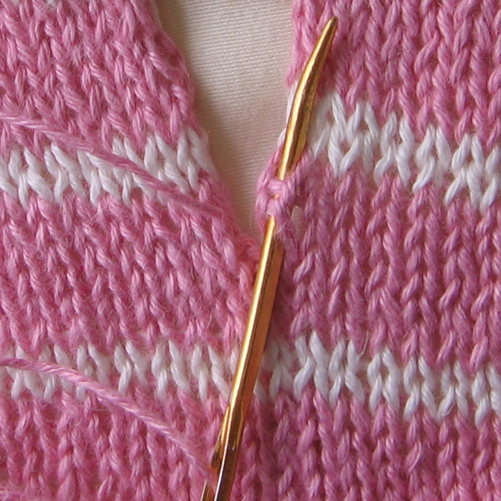 The buttonholes give the neck opening a little more stability. The neck is also shaped using short rows. This creates a gentle curve. Linen tends to be sturdy and a little stiff. To keep the neck and sleeve edges flexible, I cast off using Elizabeth Zimmerman’s Sewn Casting-Off.