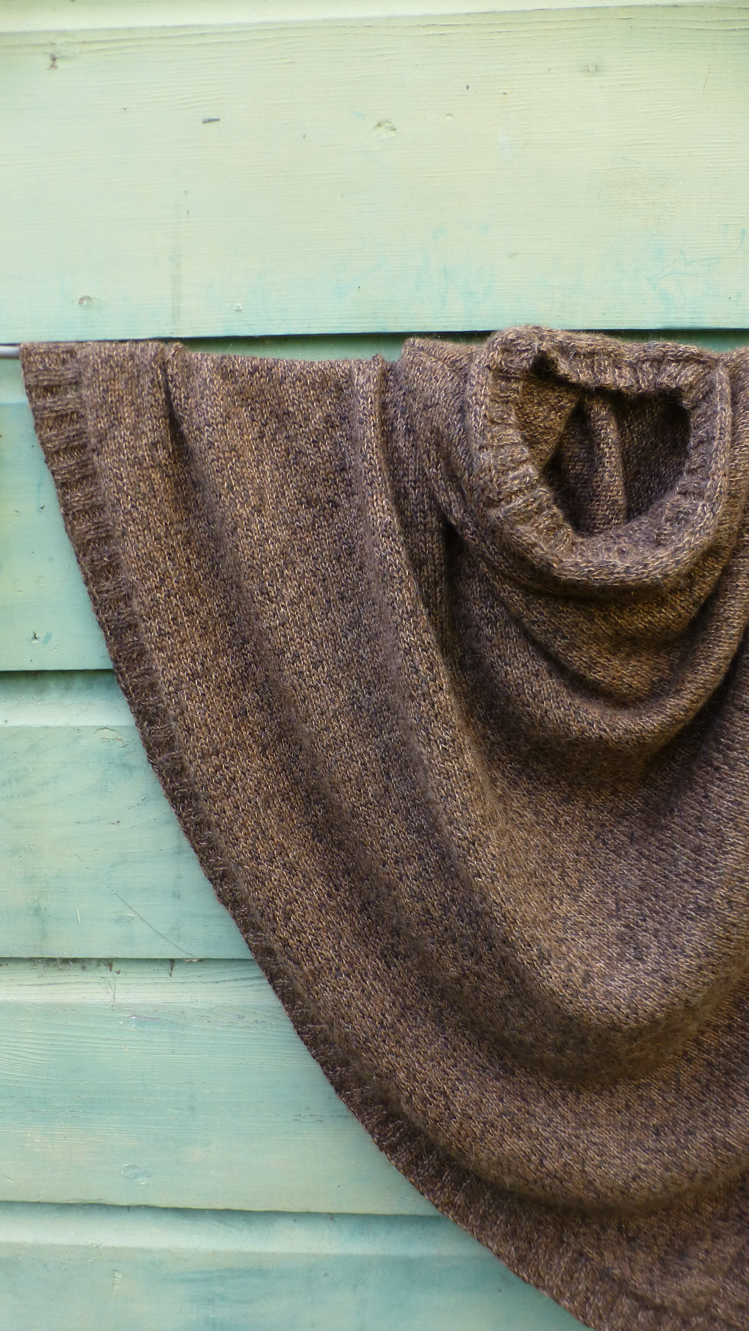 I switched to 10 1/2 needles and ribbed a few rows to gather the snuggly at the shoulders and neck. No decreases, as I didn’t want the hood to be too small.