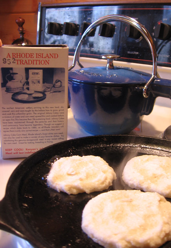 I am a sucker for packaging. Especially when the box has a recipe on it that I would like to try. And that is how I ended up with a box of Kenyon’s Stone Ground White Corn Meal; complete with recipe for Johnny Cakes.