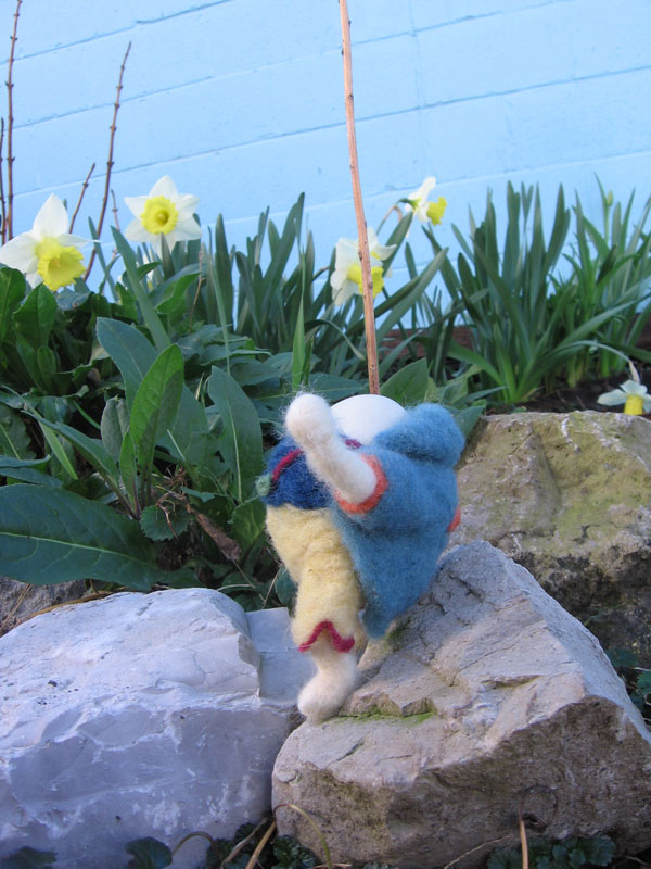 And then I knew that I needed to make Humpty Dumpty (pre-fall). I hollowed out the egg, drilled holes, and stuck pipe cleaners through for arms and legs. I wrapped white wool around the pipe cleaners to shape the arms and legs, and then added the vest and pants. Then suspenders, buttons, and trim.