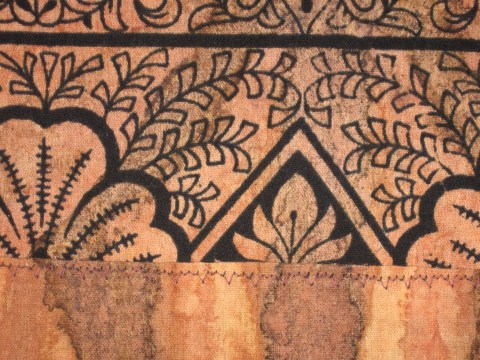 I think that the fabric was tie dyed somehow, and there is a strong band of white going around the dress. I am considering dying the fabric a little with some coffee to darken the band. I think that I will have to wear the dress a little first to decide if I like the band or not.