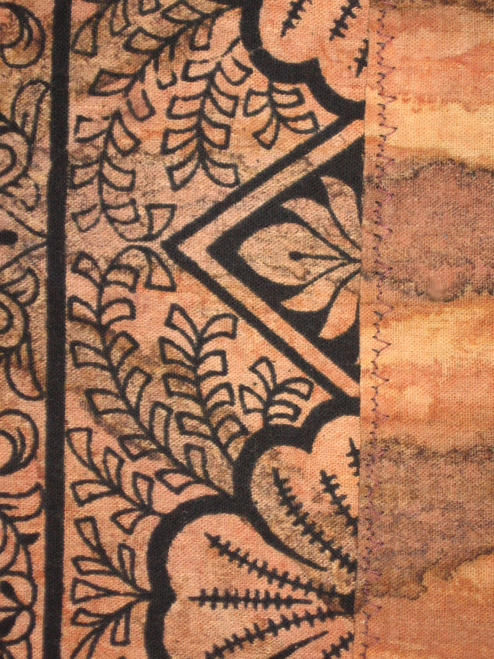 The border is really beautiful, and I experimented with my new machine to sew the border by machine instead of by hand. (I got to my room this morning, armed with all my supplies, carefully collected and selected, only to realize that I didn’t have a sewing needle…)