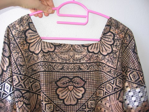 First thing was to cut the neck, square to match the pattern. The dress is rather shapeless, and almost more of a tunic. There is so much complexity in the pattern on the material that I didn’t think that it was necessary to shape the dress itself.