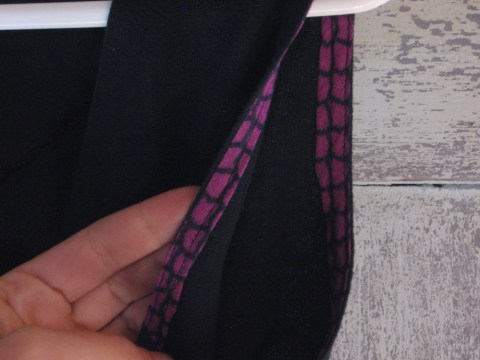 I haven’t managed to buy bias tape to line armholes and the like, so I came up with some fabric left over from another project. So the armholes are lined with purple and black spots..
